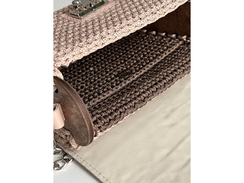 Elegantní háčkovaná kabelka s dřevěnými bočnicemi. Klopa se zapínáním a popruhy z pravé kůže. Můžete ji nosit buď na rameni nebo přes tělo jako crossbody. Délka popruhu 120 cm .