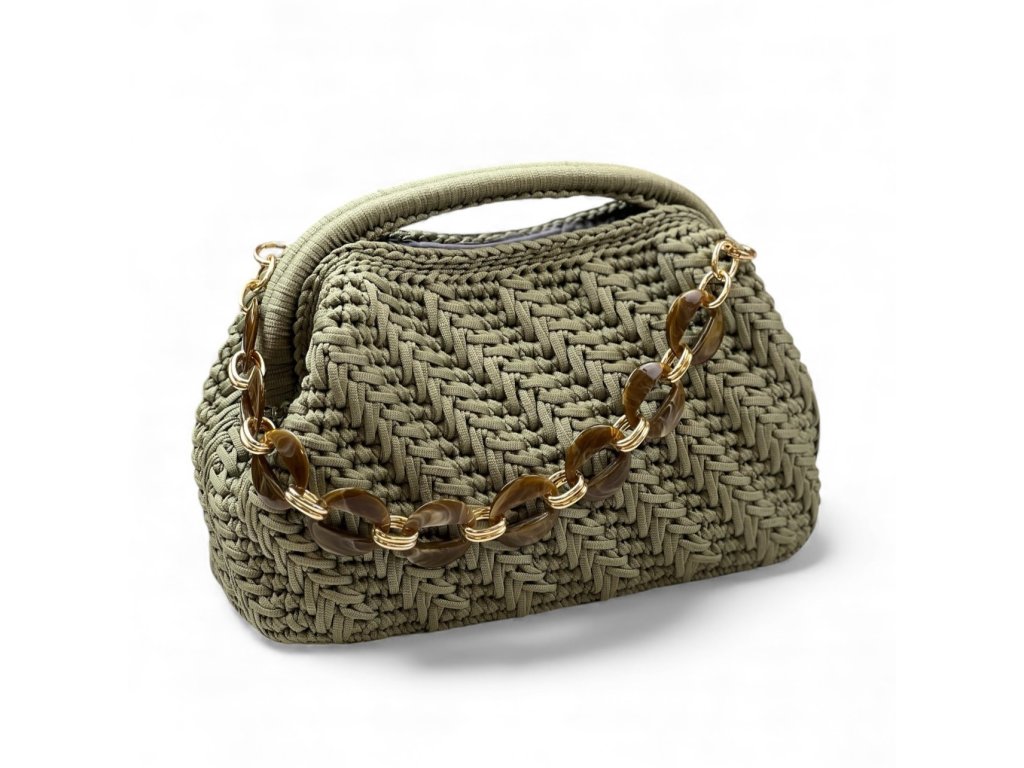 Elegantní háčkovaná kabelka Selene . Kabelka se zavírá na hliníkový rámek. K dispozici je designový řetízek 46 cm