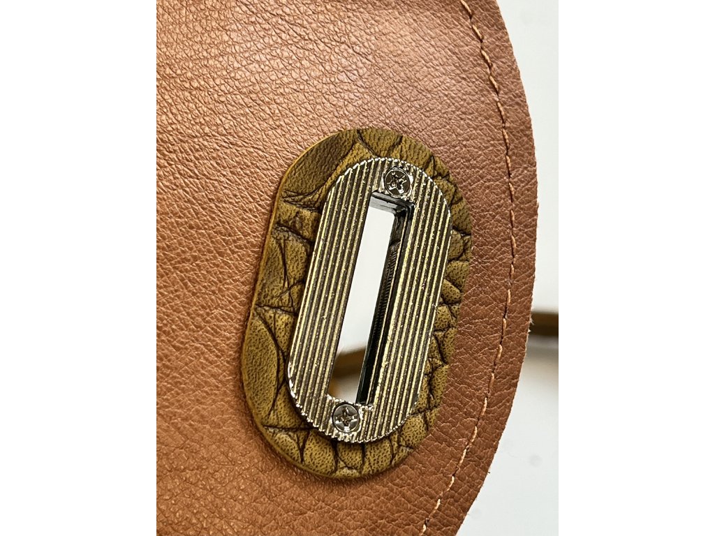 Klopa se zapínáním, dno a popruhy z pravé kůže. Popruhy jsou nastavitelné a jejich délka všetně karabin je 80cm. Je podšívka s kapsou-