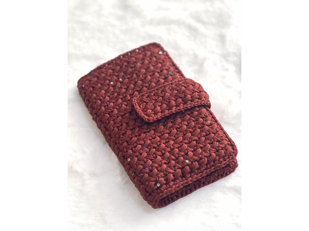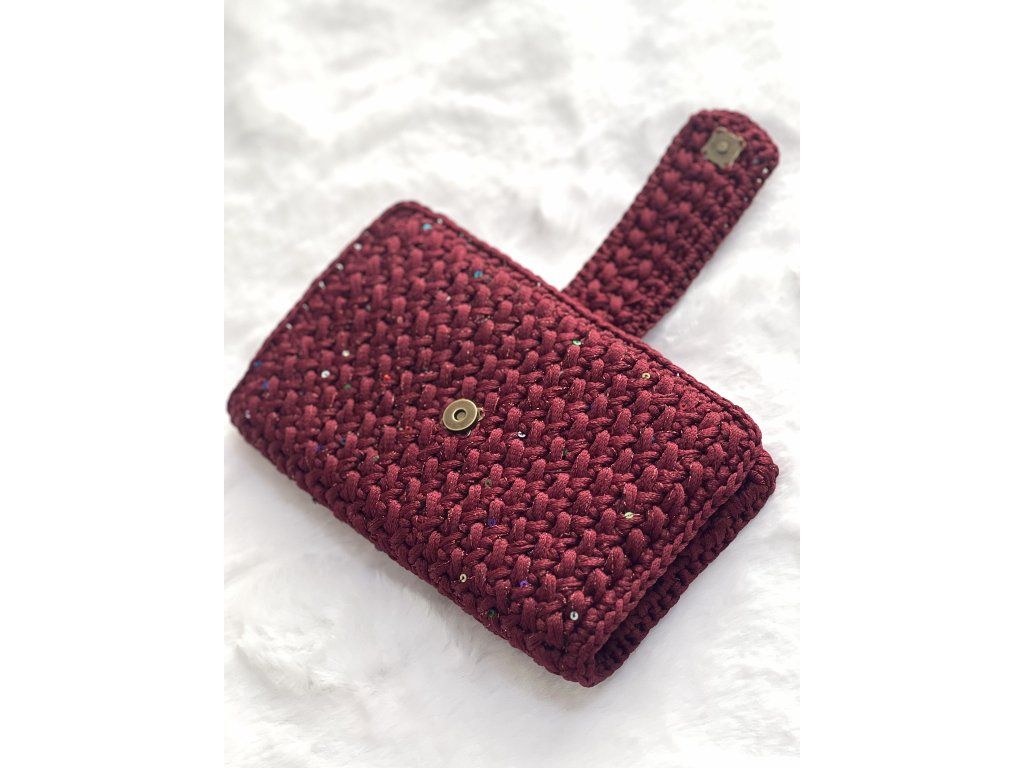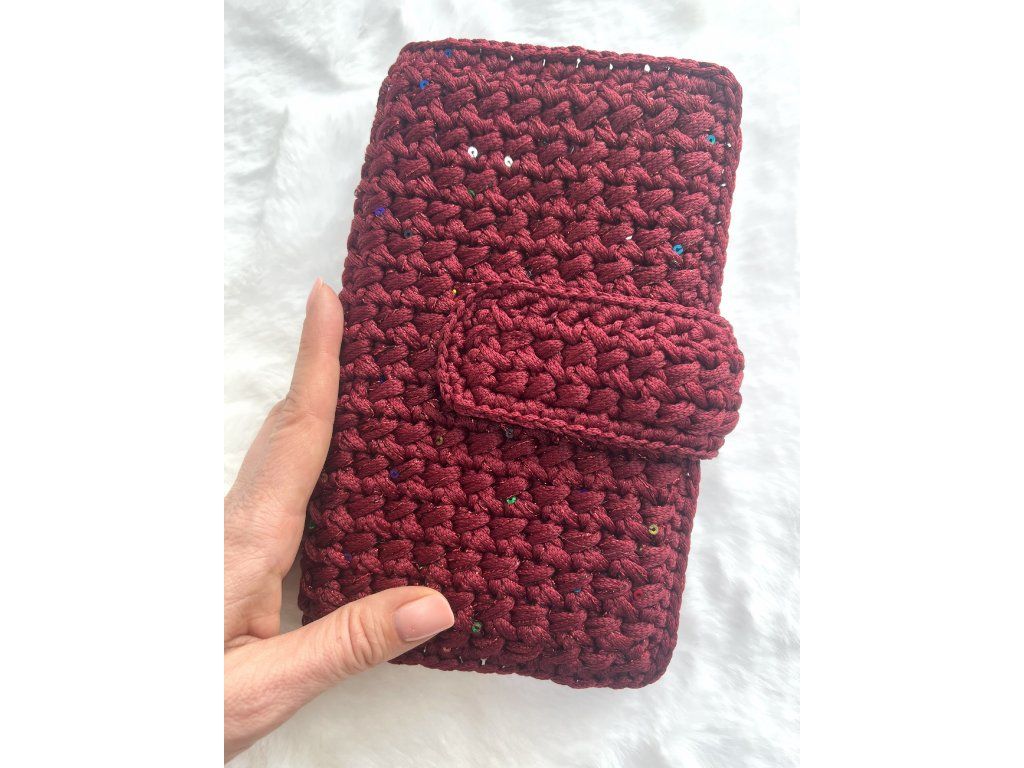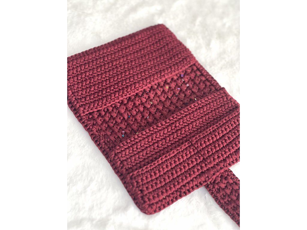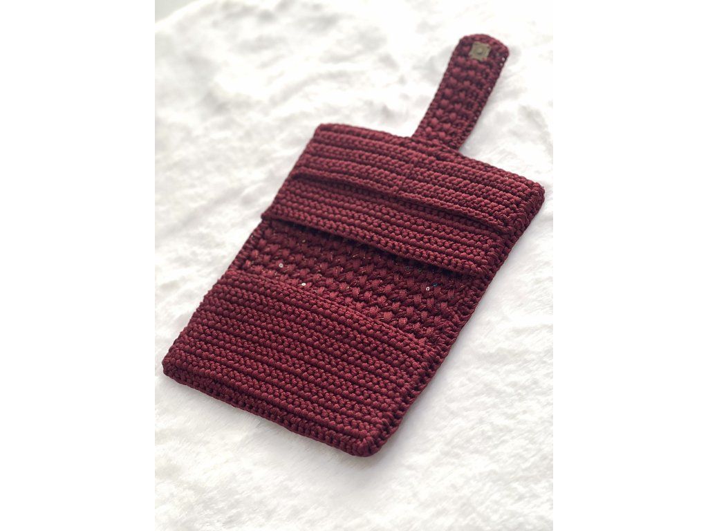 Háčkovaný organizér z pevné polyesterové šňůry v barvě třešeň je kompaktní a přitom překvapivě prostorný pomocník do kabelky. Má rozměr 21 × 13 cm, nemá podšívku (vynikne tak čistá ruční práce a struktura výpletu) a zavírá se na magnetickou patentku pro rychlé a pohodlné používání.